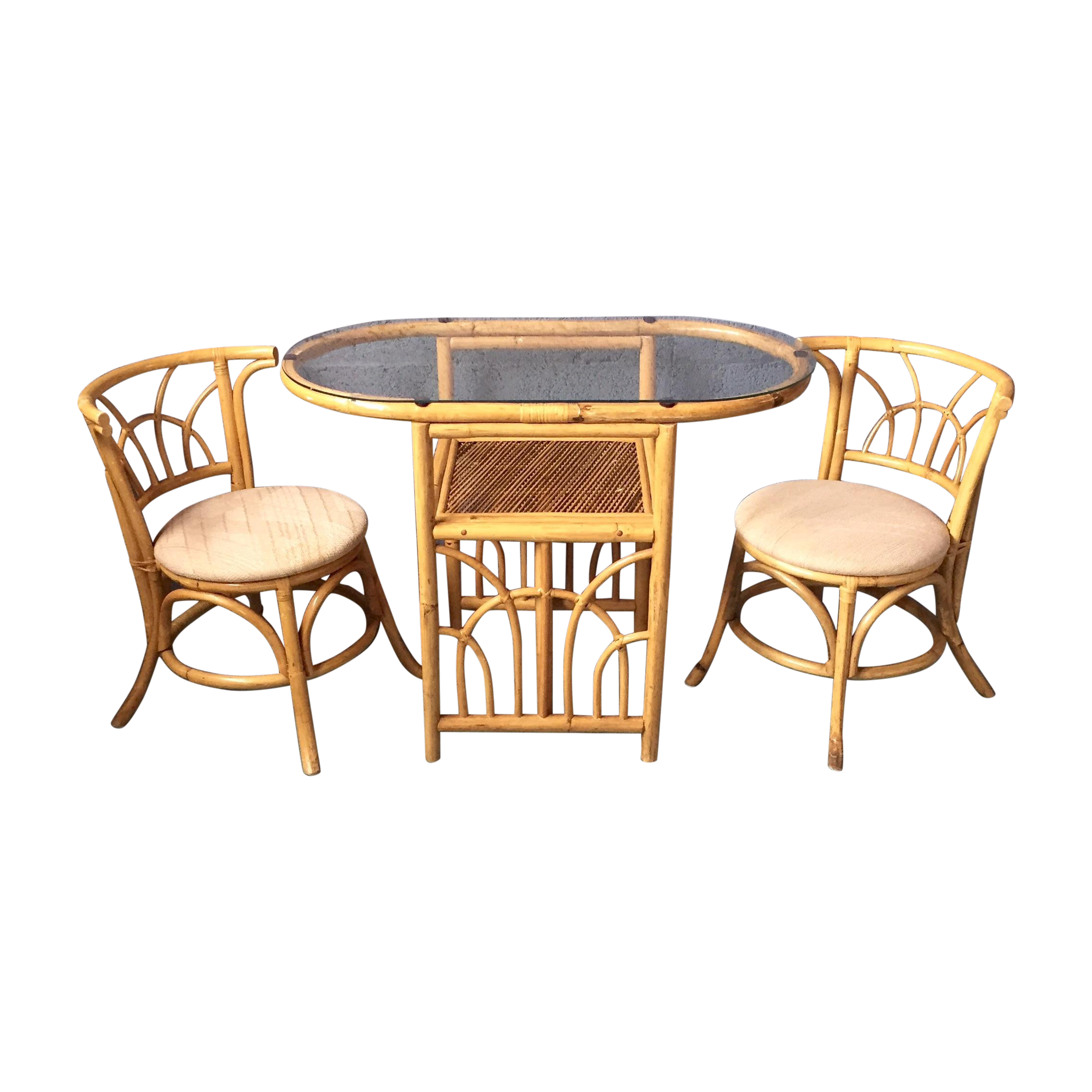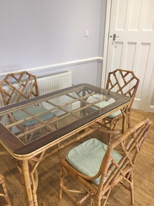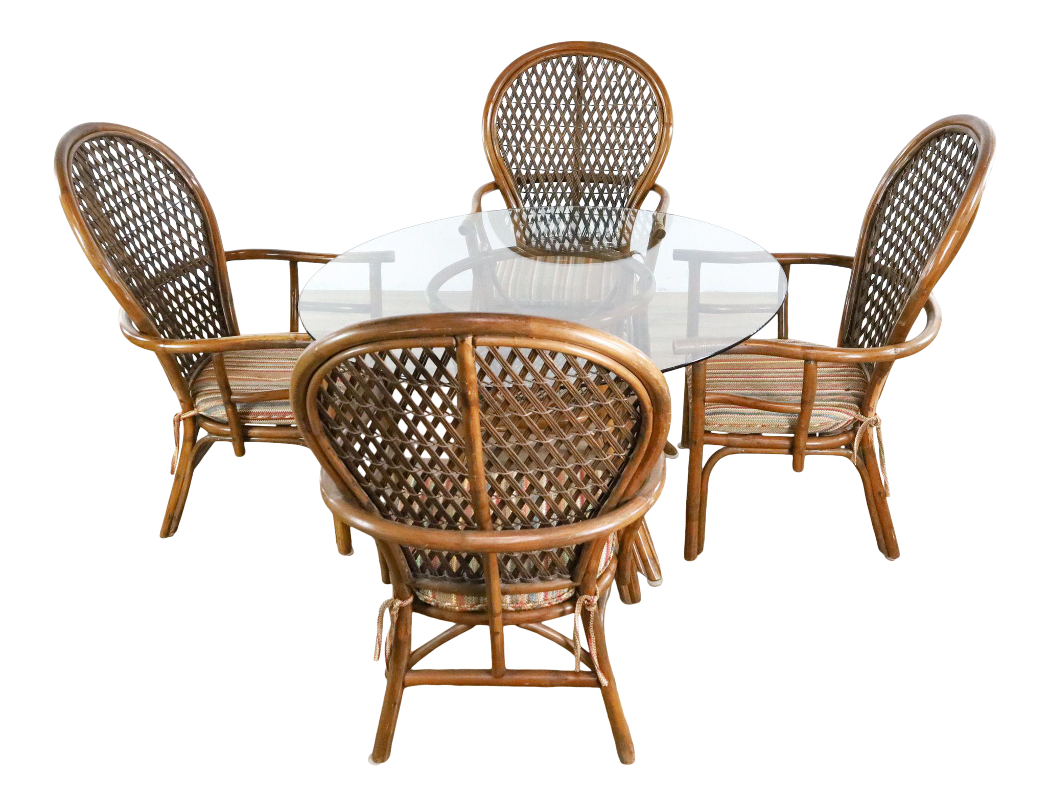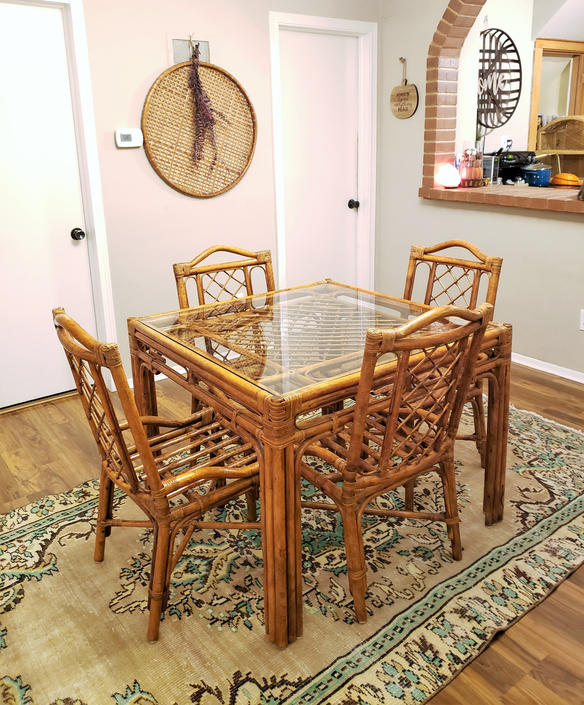 Bamboo chairs are sturdy and attractive and more hypoallergenic then wicker or rattan. The chair set is made of rattan wickers that make the set look modern and fashionable. Vintage rattan table, bamboo table, boho table, pencil reed table, double pedestal low dining table set bamboo: Supported by nine legs ending with height adjustable feet. About this item traditional indoor bamboo & rattan round dining table with 42 round glass fully assembled.woven leather bindings.